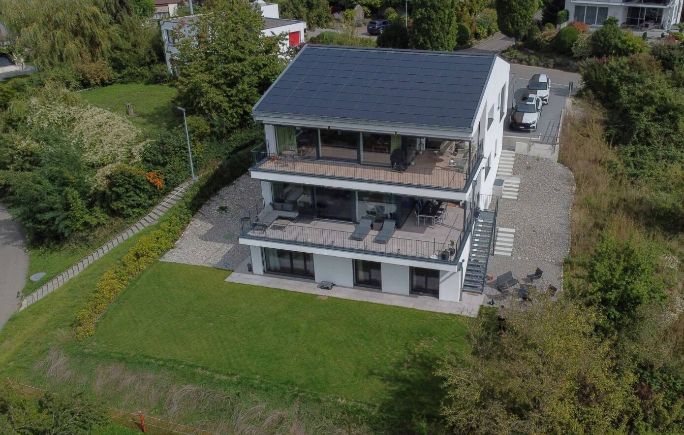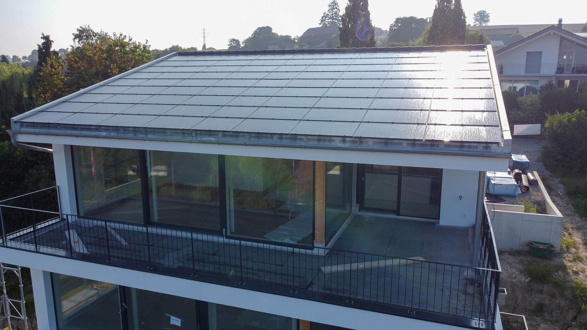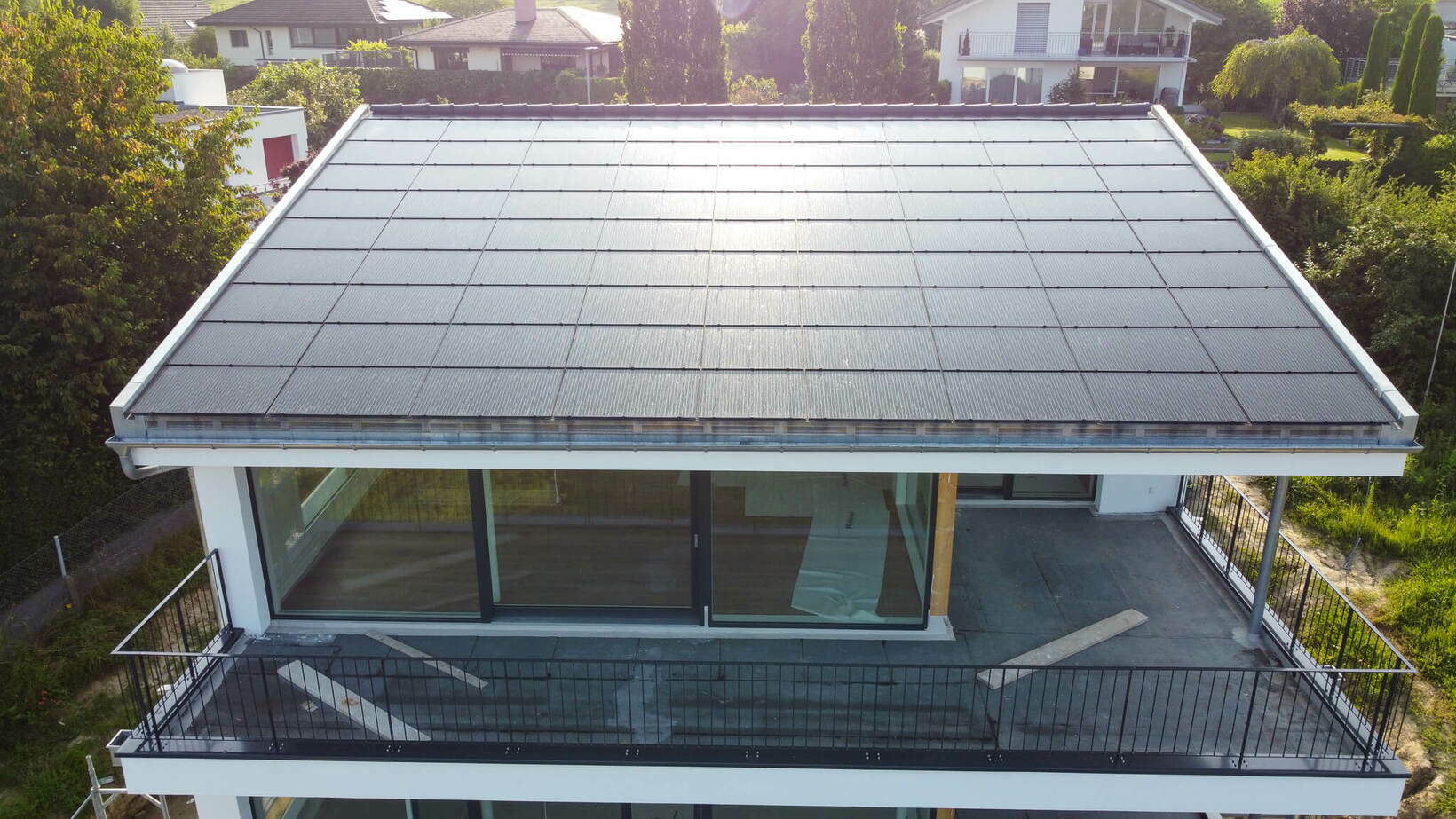 Die Indachphotovoltaikanlage integriert sich perfekt in das moderne Wohnhaus. Durch die nicht gleich Grosse Fläche des Daches konnten wir die Südseite optimal mit Modulen ausstatten.